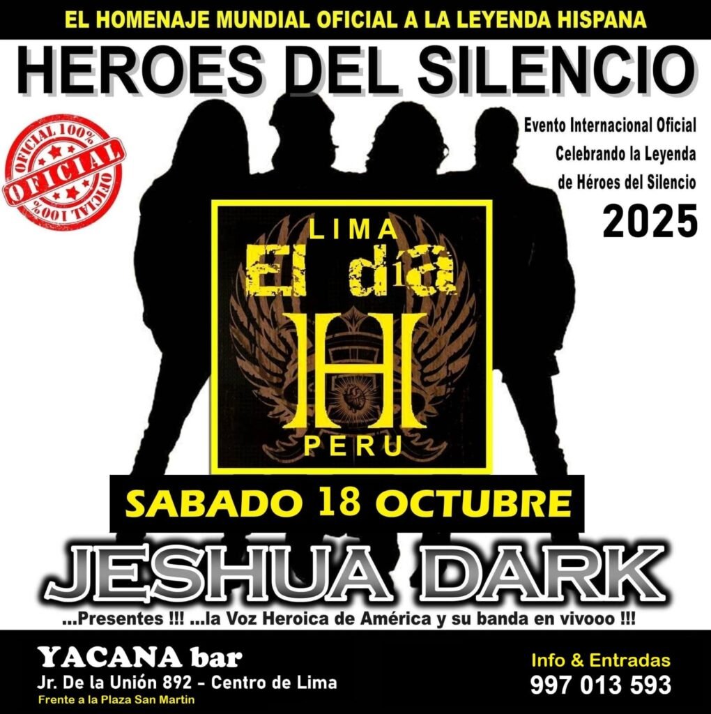 El reconocido cantante Jeshua Dark, conocido como “La voz heroica de América”, será el encargado de rendir homenaje a la mítica banda Héroes del Silencio en el marco del “Día H”, que se celebrará el próximo 18 de octubre en el Yacana Bar, en el centro de Lima.